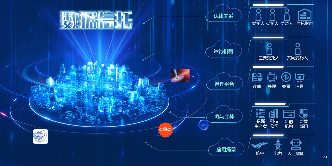 数据信托是指在符合信托法理的制度安排下,将数据全部或部分权利与权益作为信托财产,以信托法律关系约束当事人之间权利义务。从机构功能角度,可以将数据信托理解为信托公司以数据及相关产业为服务对象,运用综合金融工具提供投融资活动或受托服务,旨在服务数字经济发展和数字化社会生活需求。
